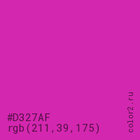 Цвет #D327AF в цветовой модели RGB обозначается тремя октетами (211, 39, 175) в десятичном формате и #D327AF в шестнадцатиричном (hex) формате, которые являются интенсивностью красного 211 (hex D3), интенсивность зелёного 39 (hex 27) и интенсивность синего 175 (hex AF).