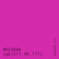 Цвет #D32BAB в цветовой модели RGB обозначается тремя октетами (211, 43, 171) в десятичном формате и #D32BAB в шестнадцатиричном (hex) формате, которые являются интенсивностью красного 211 (hex D3), интенсивность зелёного 43 (hex 2B) и интенсивность синего 171 (hex AB).