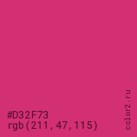 Цвет #D32F73 в цветовой модели RGB обозначается тремя октетами (211, 47, 115) в десятичном формате и #D32F73 в шестнадцатиричном (hex) формате, которые являются интенсивностью красного 211 (hex D3), интенсивность зелёного 47 (hex 2F) и интенсивность синего 115 (hex 73).