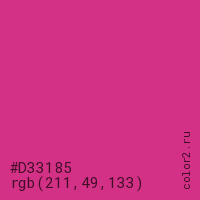 Цвет #D33185 в цветовой модели RGB обозначается тремя октетами (211, 49, 133) в десятичном формате и #D33185 в шестнадцатиричном (hex) формате, которые являются интенсивностью красного 211 (hex D3), интенсивность зелёного 49 (hex 31) и интенсивность синего 133 (hex 85).
