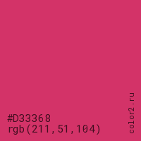 Цвет #D33368 в цветовой модели RGB обозначается тремя октетами (211, 51, 104) в десятичном формате и #D33368 в шестнадцатиричном (hex) формате, которые являются интенсивностью красного 211 (hex D3), интенсивность зелёного 51 (hex 33) и интенсивность синего 104 (hex 68).