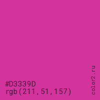 Цвет #D3339D в цветовой модели RGB обозначается тремя октетами (211, 51, 157) в десятичном формате и #D3339D в шестнадцатиричном (hex) формате, которые являются интенсивностью красного 211 (hex D3), интенсивность зелёного 51 (hex 33) и интенсивность синего 157 (hex 9D).