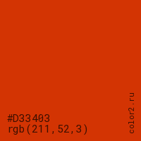 Цвет #D33403 в цветовой модели RGB обозначается тремя октетами (211, 52, 3) в десятичном формате и #D33403 в шестнадцатиричном (hex) формате, которые являются интенсивностью красного 211 (hex D3), интенсивность зелёного 52 (hex 34) и интенсивность синего 3 (hex 03).
