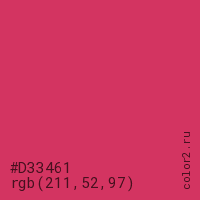 Цвет #D33461 в цветовой модели RGB обозначается тремя октетами (211, 52, 97) в десятичном формате и #D33461 в шестнадцатиричном (hex) формате, которые являются интенсивностью красного 211 (hex D3), интенсивность зелёного 52 (hex 34) и интенсивность синего 97 (hex 61).