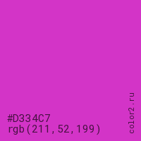 Цвет #D334C7 в цветовой модели RGB обозначается тремя октетами (211, 52, 199) в десятичном формате и #D334C7 в шестнадцатиричном (hex) формате, которые являются интенсивностью красного 211 (hex D3), интенсивность зелёного 52 (hex 34) и интенсивность синего 199 (hex C7).
