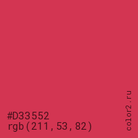 Цвет #D33552 в цветовой модели RGB обозначается тремя октетами (211, 53, 82) в десятичном формате и #D33552 в шестнадцатиричном (hex) формате, которые являются интенсивностью красного 211 (hex D3), интенсивность зелёного 53 (hex 35) и интенсивность синего 82 (hex 52).