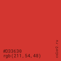 Цвет #D33630 в цветовой модели RGB обозначается тремя октетами (211, 54, 48) в десятичном формате и #D33630 в шестнадцатиричном (hex) формате, которые являются интенсивностью красного 211 (hex D3), интенсивность зелёного 54 (hex 36) и интенсивность синего 48 (hex 30).
