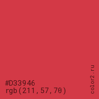 Цвет #D33946 в цветовой модели RGB обозначается тремя октетами (211, 57, 70) в десятичном формате и #D33946 в шестнадцатиричном (hex) формате, которые являются интенсивностью красного 211 (hex D3), интенсивность зелёного 57 (hex 39) и интенсивность синего 70 (hex 46).