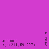 Цвет #D33BCF в цветовой модели RGB обозначается тремя октетами (211, 59, 207) в десятичном формате и #D33BCF в шестнадцатиричном (hex) формате, которые являются интенсивностью красного 211 (hex D3), интенсивность зелёного 59 (hex 3B) и интенсивность синего 207 (hex CF).