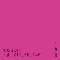 Цвет #D33C91 в цветовой модели RGB обозначается тремя октетами (211, 60, 145) в десятичном формате и #D33C91 в шестнадцатиричном (hex) формате, которые являются интенсивностью красного 211 (hex D3), интенсивность зелёного 60 (hex 3C) и интенсивность синего 145 (hex 91).