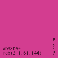 Цвет #D33D90 в цветовой модели RGB обозначается тремя октетами (211, 61, 144) в десятичном формате и #D33D90 в шестнадцатиричном (hex) формате, которые являются интенсивностью красного 211 (hex D3), интенсивность зелёного 61 (hex 3D) и интенсивность синего 144 (hex 90).
