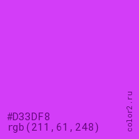 Цвет #D33DF8 в цветовой модели RGB обозначается тремя октетами (211, 61, 248) в десятичном формате и #D33DF8 в шестнадцатиричном (hex) формате, которые являются интенсивностью красного 211 (hex D3), интенсивность зелёного 61 (hex 3D) и интенсивность синего 248 (hex F8).