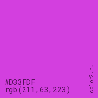 Цвет #D33FDF в цветовой модели RGB обозначается тремя октетами (211, 63, 223) в десятичном формате и #D33FDF в шестнадцатиричном (hex) формате, которые являются интенсивностью красного 211 (hex D3), интенсивность зелёного 63 (hex 3F) и интенсивность синего 223 (hex DF).