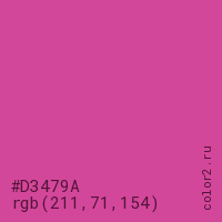 Цвет #D3479A в цветовой модели RGB обозначается тремя октетами (211, 71, 154) в десятичном формате и #D3479A в шестнадцатиричном (hex) формате, которые являются интенсивностью красного 211 (hex D3), интенсивность зелёного 71 (hex 47) и интенсивность синего 154 (hex 9A).