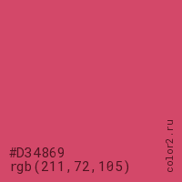Цвет #D34869 в цветовой модели RGB обозначается тремя октетами (211, 72, 105) в десятичном формате и #D34869 в шестнадцатиричном (hex) формате, которые являются интенсивностью красного 211 (hex D3), интенсивность зелёного 72 (hex 48) и интенсивность синего 105 (hex 69).