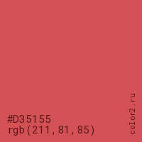 Цвет #D35155 в цветовой модели RGB обозначается тремя октетами (211, 81, 85) в десятичном формате и #D35155 в шестнадцатиричном (hex) формате, которые являются интенсивностью красного 211 (hex D3), интенсивность зелёного 81 (hex 51) и интенсивность синего 85 (hex 55).