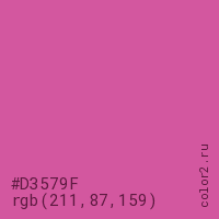 Цвет #D3579F в цветовой модели RGB обозначается тремя октетами (211, 87, 159) в десятичном формате и #D3579F в шестнадцатиричном (hex) формате, которые являются интенсивностью красного 211 (hex D3), интенсивность зелёного 87 (hex 57) и интенсивность синего 159 (hex 9F).