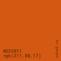 Цвет #D35811 в цветовой модели RGB обозначается тремя октетами (211, 88, 17) в десятичном формате и #D35811 в шестнадцатиричном (hex) формате, которые являются интенсивностью красного 211 (hex D3), интенсивность зелёного 88 (hex 58) и интенсивность синего 17 (hex 11).