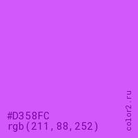Цвет #D358FC в цветовой модели RGB обозначается тремя октетами (211, 88, 252) в десятичном формате и #D358FC в шестнадцатиричном (hex) формате, которые являются интенсивностью красного 211 (hex D3), интенсивность зелёного 88 (hex 58) и интенсивность синего 252 (hex FC).