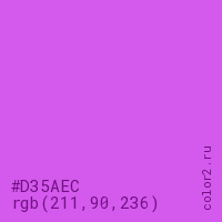 Цвет #D35AEC в цветовой модели RGB обозначается тремя октетами (211, 90, 236) в десятичном формате и #D35AEC в шестнадцатиричном (hex) формате, которые являются интенсивностью красного 211 (hex D3), интенсивность зелёного 90 (hex 5A) и интенсивность синего 236 (hex EC).