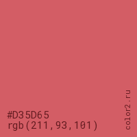 Цвет #D35D65 в цветовой модели RGB обозначается тремя октетами (211, 93, 101) в десятичном формате и #D35D65 в шестнадцатиричном (hex) формате, которые являются интенсивностью красного 211 (hex D3), интенсивность зелёного 93 (hex 5D) и интенсивность синего 101 (hex 65).