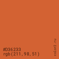 Цвет #D36233 в цветовой модели RGB обозначается тремя октетами (211, 98, 51) в десятичном формате и #D36233 в шестнадцатиричном (hex) формате, которые являются интенсивностью красного 211 (hex D3), интенсивность зелёного 98 (hex 62) и интенсивность синего 51 (hex 33).