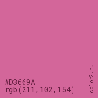 Цвет #D3669A в цветовой модели RGB обозначается тремя октетами (211, 102, 154) в десятичном формате и #D3669A в шестнадцатиричном (hex) формате, которые являются интенсивностью красного 211 (hex D3), интенсивность зелёного 102 (hex 66) и интенсивность синего 154 (hex 9A).