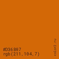 Цвет #D36807 в цветовой модели RGB обозначается тремя октетами (211, 104, 7) в десятичном формате и #D36807 в шестнадцатиричном (hex) формате, которые являются интенсивностью красного 211 (hex D3), интенсивность зелёного 104 (hex 68) и интенсивность синего 7 (hex 07).
