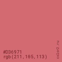 Цвет #D36971 в цветовой модели RGB обозначается тремя октетами (211, 105, 113) в десятичном формате и #D36971 в шестнадцатиричном (hex) формате, которые являются интенсивностью красного 211 (hex D3), интенсивность зелёного 105 (hex 69) и интенсивность синего 113 (hex 71).