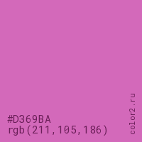 Цвет #D369BA в цветовой модели RGB обозначается тремя октетами (211, 105, 186) в десятичном формате и #D369BA в шестнадцатиричном (hex) формате, которые являются интенсивностью красного 211 (hex D3), интенсивность зелёного 105 (hex 69) и интенсивность синего 186 (hex BA).