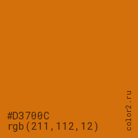 Цвет #D3700C в цветовой модели RGB обозначается тремя октетами (211, 112, 12) в десятичном формате и #D3700C в шестнадцатиричном (hex) формате, которые являются интенсивностью красного 211 (hex D3), интенсивность зелёного 112 (hex 70) и интенсивность синего 12 (hex 0C).
