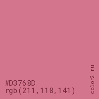 Цвет #D3768D в цветовой модели RGB обозначается тремя октетами (211, 118, 141) в десятичном формате и #D3768D в шестнадцатиричном (hex) формате, которые являются интенсивностью красного 211 (hex D3), интенсивность зелёного 118 (hex 76) и интенсивность синего 141 (hex 8D).