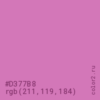 Цвет #D377B8 в цветовой модели RGB обозначается тремя октетами (211, 119, 184) в десятичном формате и #D377B8 в шестнадцатиричном (hex) формате, которые являются интенсивностью красного 211 (hex D3), интенсивность зелёного 119 (hex 77) и интенсивность синего 184 (hex B8).