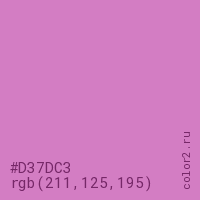 Цвет #D37DC3 в цветовой модели RGB обозначается тремя октетами (211, 125, 195) в десятичном формате и #D37DC3 в шестнадцатиричном (hex) формате, которые являются интенсивностью красного 211 (hex D3), интенсивность зелёного 125 (hex 7D) и интенсивность синего 195 (hex C3).