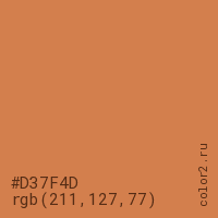 Цвет #D37F4D в цветовой модели RGB обозначается тремя октетами (211, 127, 77) в десятичном формате и #D37F4D в шестнадцатиричном (hex) формате, которые являются интенсивностью красного 211 (hex D3), интенсивность зелёного 127 (hex 7F) и интенсивность синего 77 (hex 4D).