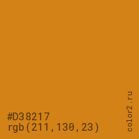 Цвет #D38217 в цветовой модели RGB обозначается тремя октетами (211, 130, 23) в десятичном формате и #D38217 в шестнадцатиричном (hex) формате, которые являются интенсивностью красного 211 (hex D3), интенсивность зелёного 130 (hex 82) и интенсивность синего 23 (hex 17).