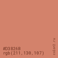Цвет #D3826B в цветовой модели RGB обозначается тремя октетами (211, 130, 107) в десятичном формате и #D3826B в шестнадцатиричном (hex) формате, которые являются интенсивностью красного 211 (hex D3), интенсивность зелёного 130 (hex 82) и интенсивность синего 107 (hex 6B).