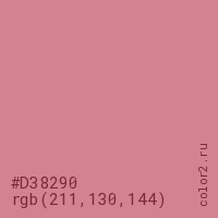 Цвет #D38290 в цветовой модели RGB обозначается тремя октетами (211, 130, 144) в десятичном формате и #D38290 в шестнадцатиричном (hex) формате, которые являются интенсивностью красного 211 (hex D3), интенсивность зелёного 130 (hex 82) и интенсивность синего 144 (hex 90).