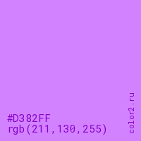 Цвет #D382FF в цветовой модели RGB обозначается тремя октетами (211, 130, 255) в десятичном формате и #D382FF в шестнадцатиричном (hex) формате, которые являются интенсивностью красного 211 (hex D3), интенсивность зелёного 130 (hex 82) и интенсивность синего 255 (hex FF).
