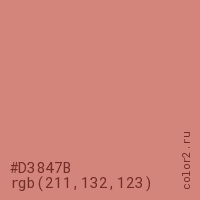 Цвет #D3847B в цветовой модели RGB обозначается тремя октетами (211, 132, 123) в десятичном формате и #D3847B в шестнадцатиричном (hex) формате, которые являются интенсивностью красного 211 (hex D3), интенсивность зелёного 132 (hex 84) и интенсивность синего 123 (hex 7B).