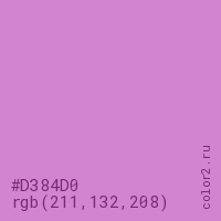 Цвет #D384D0 в цветовой модели RGB обозначается тремя октетами (211, 132, 208) в десятичном формате и #D384D0 в шестнадцатиричном (hex) формате, которые являются интенсивностью красного 211 (hex D3), интенсивность зелёного 132 (hex 84) и интенсивность синего 208 (hex D0).