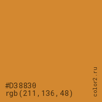 Цвет #D38830 в цветовой модели RGB обозначается тремя октетами (211, 136, 48) в десятичном формате и #D38830 в шестнадцатиричном (hex) формате, которые являются интенсивностью красного 211 (hex D3), интенсивность зелёного 136 (hex 88) и интенсивность синего 48 (hex 30).