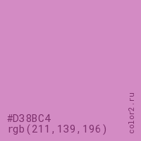 Цвет #D38BC4 в цветовой модели RGB обозначается тремя октетами (211, 139, 196) в десятичном формате и #D38BC4 в шестнадцатиричном (hex) формате, которые являются интенсивностью красного 211 (hex D3), интенсивность зелёного 139 (hex 8B) и интенсивность синего 196 (hex C4).