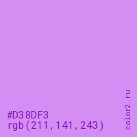 Цвет #D38DF3 в цветовой модели RGB обозначается тремя октетами (211, 141, 243) в десятичном формате и #D38DF3 в шестнадцатиричном (hex) формате, которые являются интенсивностью красного 211 (hex D3), интенсивность зелёного 141 (hex 8D) и интенсивность синего 243 (hex F3).