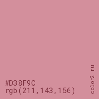 Цвет #D38F9C в цветовой модели RGB обозначается тремя октетами (211, 143, 156) в десятичном формате и #D38F9C в шестнадцатиричном (hex) формате, которые являются интенсивностью красного 211 (hex D3), интенсивность зелёного 143 (hex 8F) и интенсивность синего 156 (hex 9C).