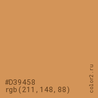 Цвет #D39458 в цветовой модели RGB обозначается тремя октетами (211, 148, 88) в десятичном формате и #D39458 в шестнадцатиричном (hex) формате, которые являются интенсивностью красного 211 (hex D3), интенсивность зелёного 148 (hex 94) и интенсивность синего 88 (hex 58).
