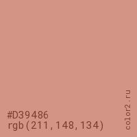 Цвет #D39486 в цветовой модели RGB обозначается тремя октетами (211, 148, 134) в десятичном формате и #D39486 в шестнадцатиричном (hex) формате, которые являются интенсивностью красного 211 (hex D3), интенсивность зелёного 148 (hex 94) и интенсивность синего 134 (hex 86).