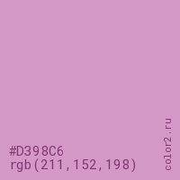 Цвет #D398C6 в цветовой модели RGB обозначается тремя октетами (211, 152, 198) в десятичном формате и #D398C6 в шестнадцатиричном (hex) формате, которые являются интенсивностью красного 211 (hex D3), интенсивность зелёного 152 (hex 98) и интенсивность синего 198 (hex C6).