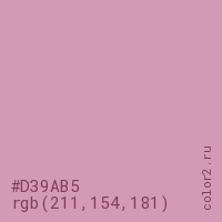 Цвет #D39AB5 в цветовой модели RGB обозначается тремя октетами (211, 154, 181) в десятичном формате и #D39AB5 в шестнадцатиричном (hex) формате, которые являются интенсивностью красного 211 (hex D3), интенсивность зелёного 154 (hex 9A) и интенсивность синего 181 (hex B5).