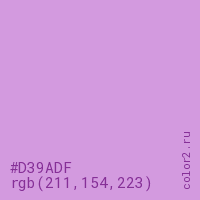 Цвет #D39ADF в цветовой модели RGB обозначается тремя октетами (211, 154, 223) в десятичном формате и #D39ADF в шестнадцатиричном (hex) формате, которые являются интенсивностью красного 211 (hex D3), интенсивность зелёного 154 (hex 9A) и интенсивность синего 223 (hex DF).